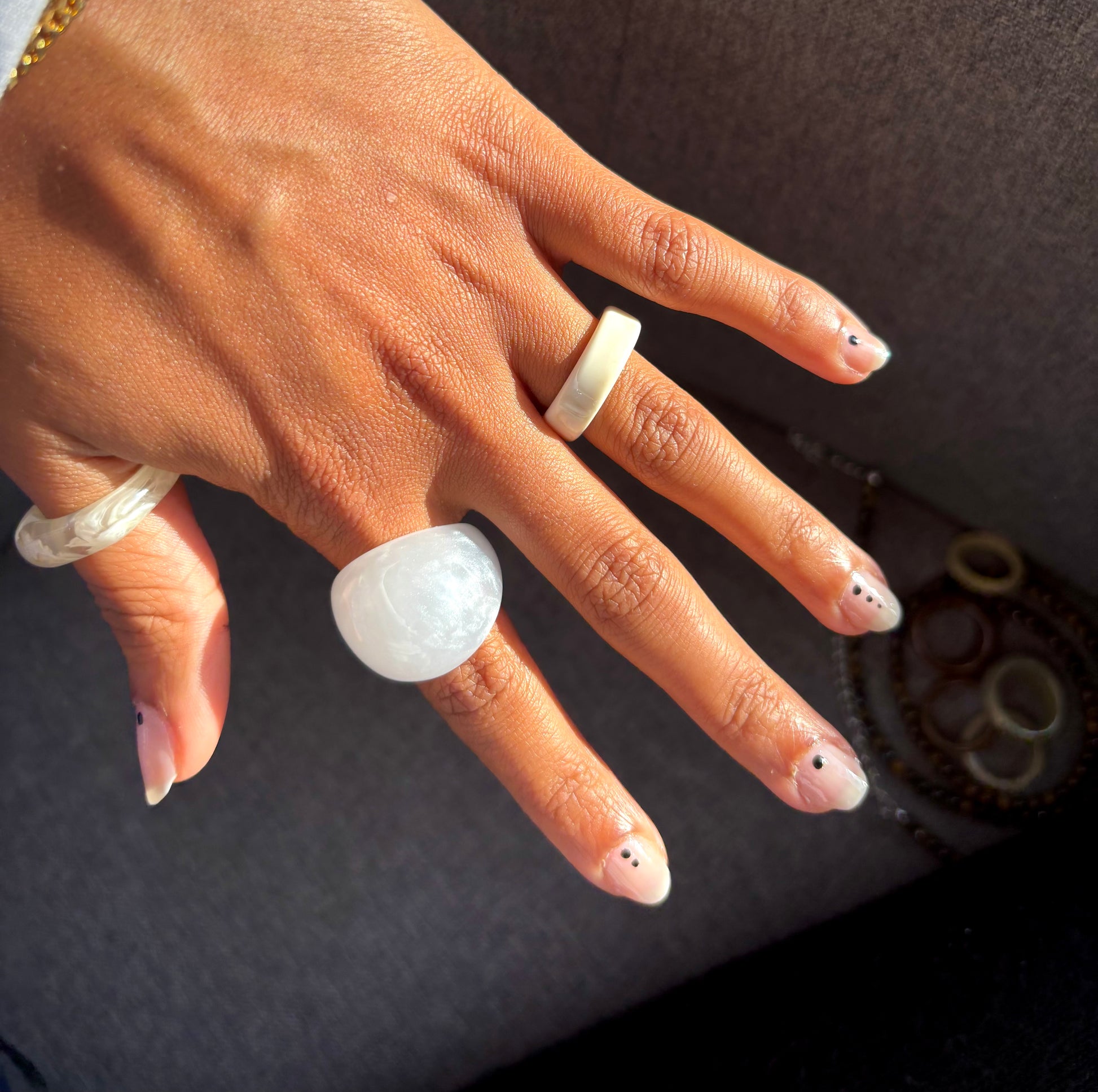The Clay Stack features 3 handcrafted rings from Portugal, designed to be mixed and matched in endless combinations. The ring diameters range from 1.8 cm to 2.2 cm, making them perfect for wearing on different fingers.